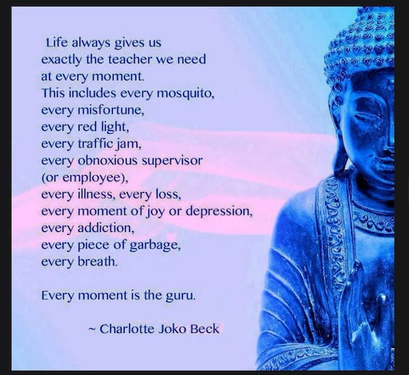“Life always gives us exactly the teacher we need at every moment. This includes every mosquito, every misfortune, every red light, every traffic jam, every obnoxious supervisor (or employee), every illness, every loss, every moment of joy or depression, every addiction, every piece of garbage, every breath. Every moment is the guru.”