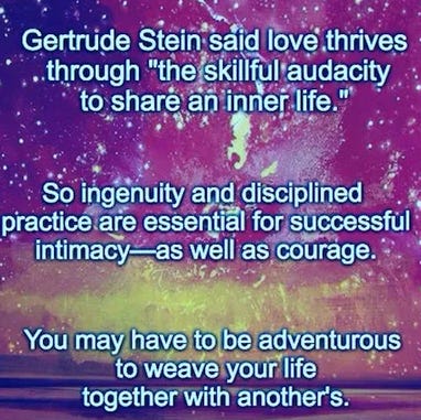 Intimate relationship is an artful game with shifting rules and surprise plot twists, so we lovers need to stay nimble, experimental, and awake. The alliance we begin is never the relationship we will have three years later, or five, or ten. We change. Our partners change. Life barges in with its unruly interventions—illness, career upheavals, creative awakenings, grief, unexpected joy.