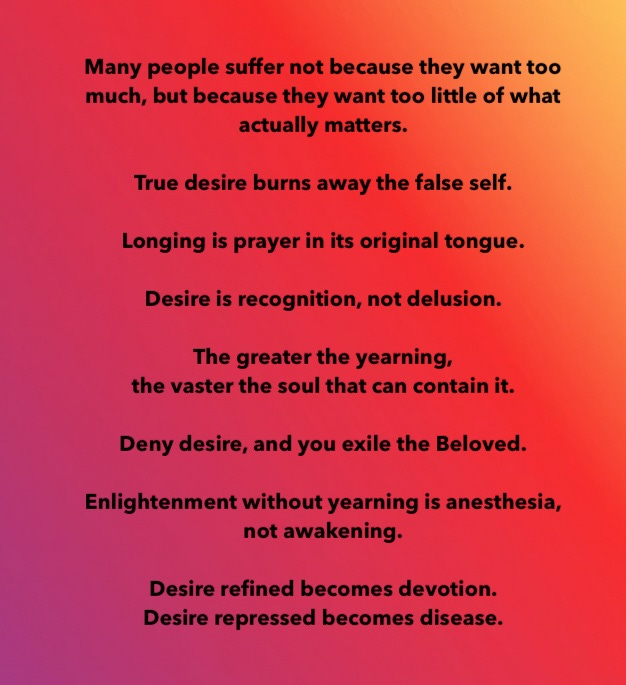 But I urge us to celebrate and embrace beautiful desires: the longings that, when pursued with zeal and devout intention, render us more magnificent and inspire us to make the world more luminous.