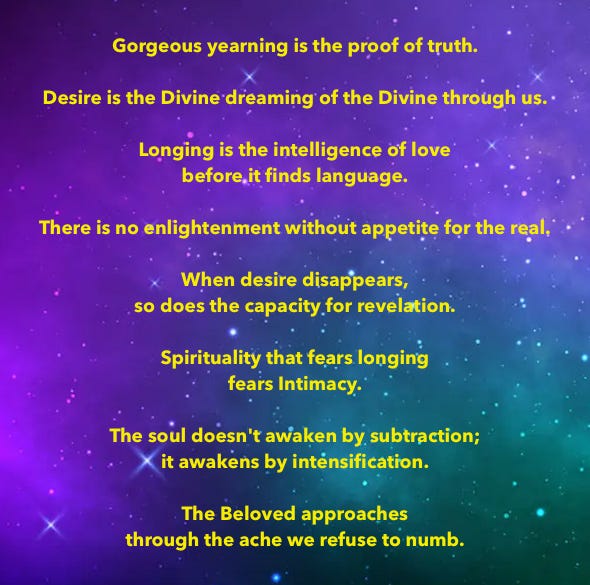 While some spiritual paths preach the renunciation of desire as the path to freedom, I live according to a different truth: that devotional attachment to my righteous desires is a form of sovereign emancipation. It’s a gateway to becoming more fully alive and more vividly engaged with the sublime project of being creatively incarnate as a human being on this messy and gorgeous planet.