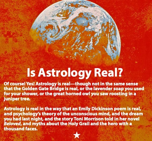 It's a blend of a memoir, oracles for readers, and essays about the art of astrology and poetic intelligence. The eclectic tone ranges from pop to literary; from lyrical to philosophical; from critiques of hyper-rational, machine-style thinking to a celebration of the scientific method and soulful thinking.