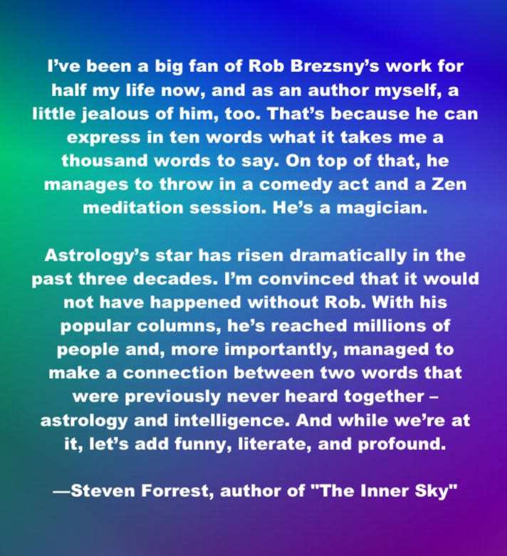 A long-time (well over 2 decades) subscriber to your emails and fellow astrologer of about 40 years, some of your horoscopes for Aquarius have been so right on for me; I fondly remember one in particular in 2004 that talked about "happy season" for us. That's when I met my life partner. <smile> Today, I awoke feeling relatively calm, my 5th morning waking up with the knowledge that I likely have cancer. I couldn't get back to sleep and so I scrolled through my emails, discarding a few, clicking on some news links and then saw yours. I didn't know you had cancer in 2016, don't recall you sharing (perhaps you did), but hearing about your journey this morning brought some tears (I know I must allow for all emotions on this journey) and then a very welcome peacefulness, not just because you are a survivor but because you spoke to the part of me that hopes to take this journey with grace and awareness of all the ways this could help me become more compassionate and wiser. Things have already happened in just these 5 days that touched my heart and surprised me. To your credit, your prior two or three horoscopes helped me "prepare" for how I want/hope to go through this. So, thank you. For your wisdom, compassion, courage, and, quite simply, for being here.