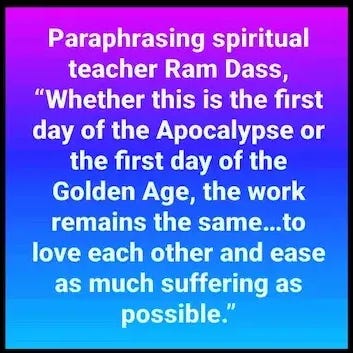 What else can we do to help each other? We can conspire together to carry out the agenda that futurist Barbara Marx Hubbard names: to hospice what's dying and midwife what's being born.