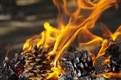 The cones hang on the trees, waiting. The seeds inside are viable but imprisoned. Neither rain, nor sunshine, nor gentle coaxing can make them release. Only one thing has that power: When the flames come, the resin melts, the cone scales curl back, and the seeds finally spill out onto the forest floor.