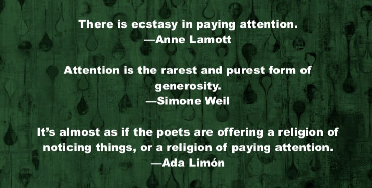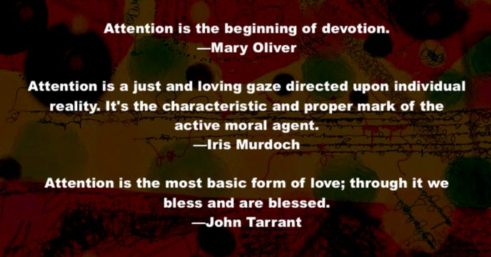 Attention is sacred. When you love one thing deeply—one forest, one injustice, one beloved body, one gorgeous bird—you’re not abandoning the rest of existence. You’re affecting the whole.