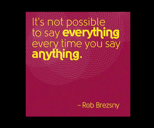 The quote “It’s not possible to say EVERYTHING every time you say ANYTHING” also protects against a subtle form of ego inflation. The fantasy that one could ever speak for everything is the voice of the inflated savior or the anxious perfectionist.