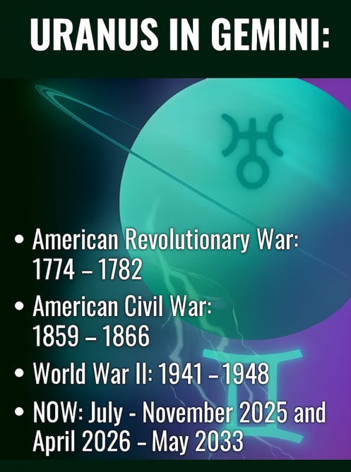 Now: It's July 2025, and Uranus is once again rumbling through Gemini. This time its upheavals and reinventions are coming for our relationship with information, cognition, learning, and truth. And who knows how it will ransack and remake our structures and systems?