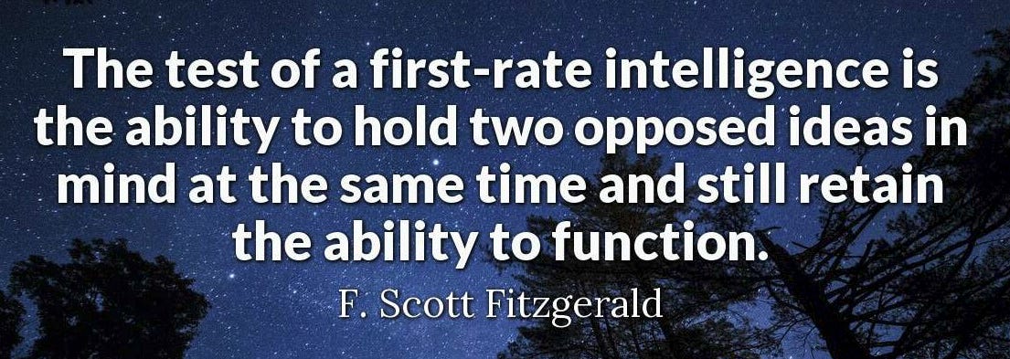 F. Scott Fitzgerald's principle applies here: "The test of a first-rate intelligence is the ability to hold two opposed ideas in the mind at the same time, and still retain the ability to function."